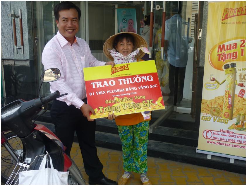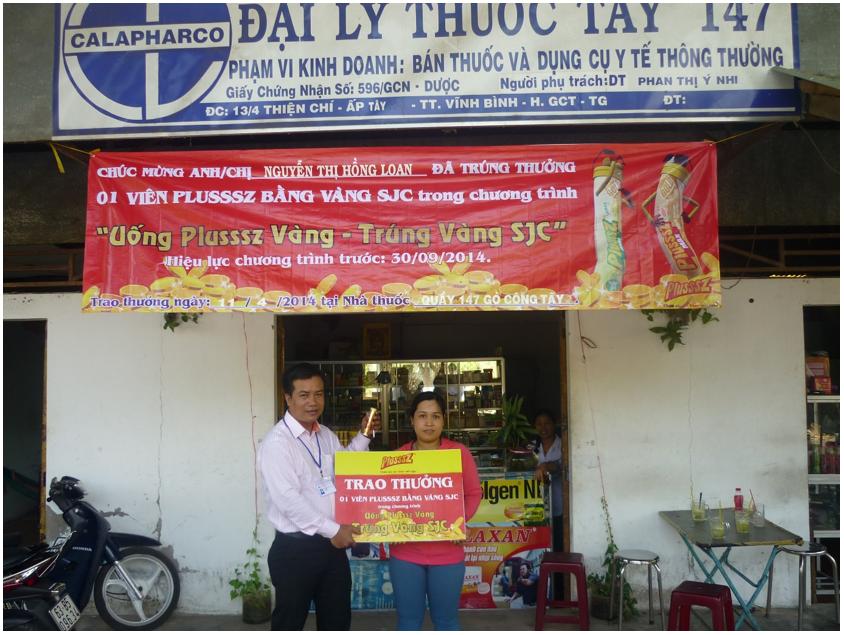 Vào ngày 02/04/2014, Chị Nguyễn Thị Hồng Loan (0166 983 9083) - một khách hàng ở Tiền Giang đã trúng thưởng 01viên Plusssz vàng trong chương trình Uống Plusssz Vàng Trúng Vàng SJC vừa được bắt đầu hôm 01/04. Đại diện nhãn hàng đã đến tận nơi trao thưởng 01 viên Plusssz vàng cho chị Nguyễn Thị Hồng Loan và 20 tube Plusssz Gold cho đại lý thuốc tây quầy 147 - nơi chị Loan đã mua tube thuốc trúng thưởng.