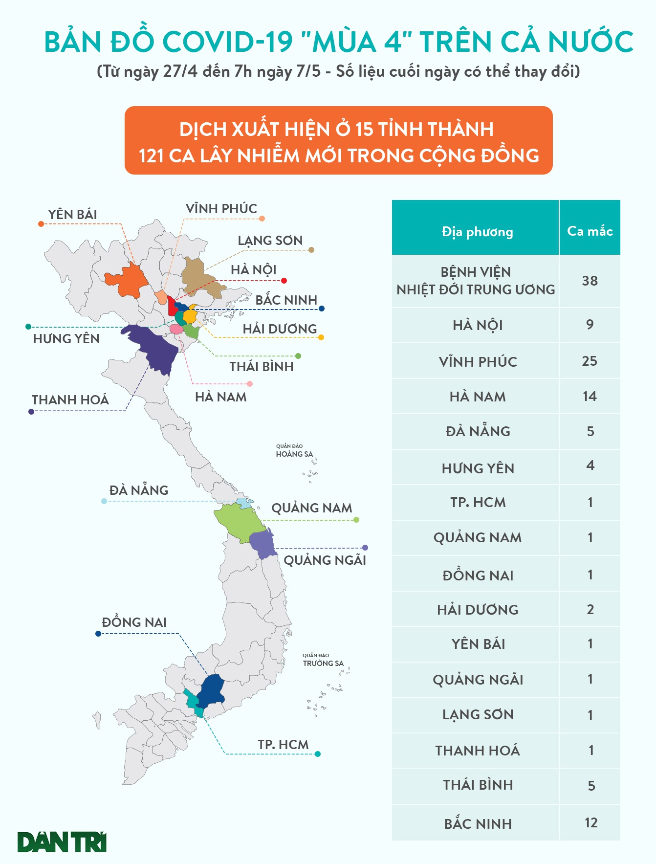 Chỉ trong vòng 11 ngày (27/4- 7/5), dịch Covid-19 đã xuất hiện ở 15 tỉnh, thành trên cả nước. Theo số liệu Bộ Y tế công bố tính đến sáng nay 7/5, đã có 121 ca mắc mới trong cộng đồng...