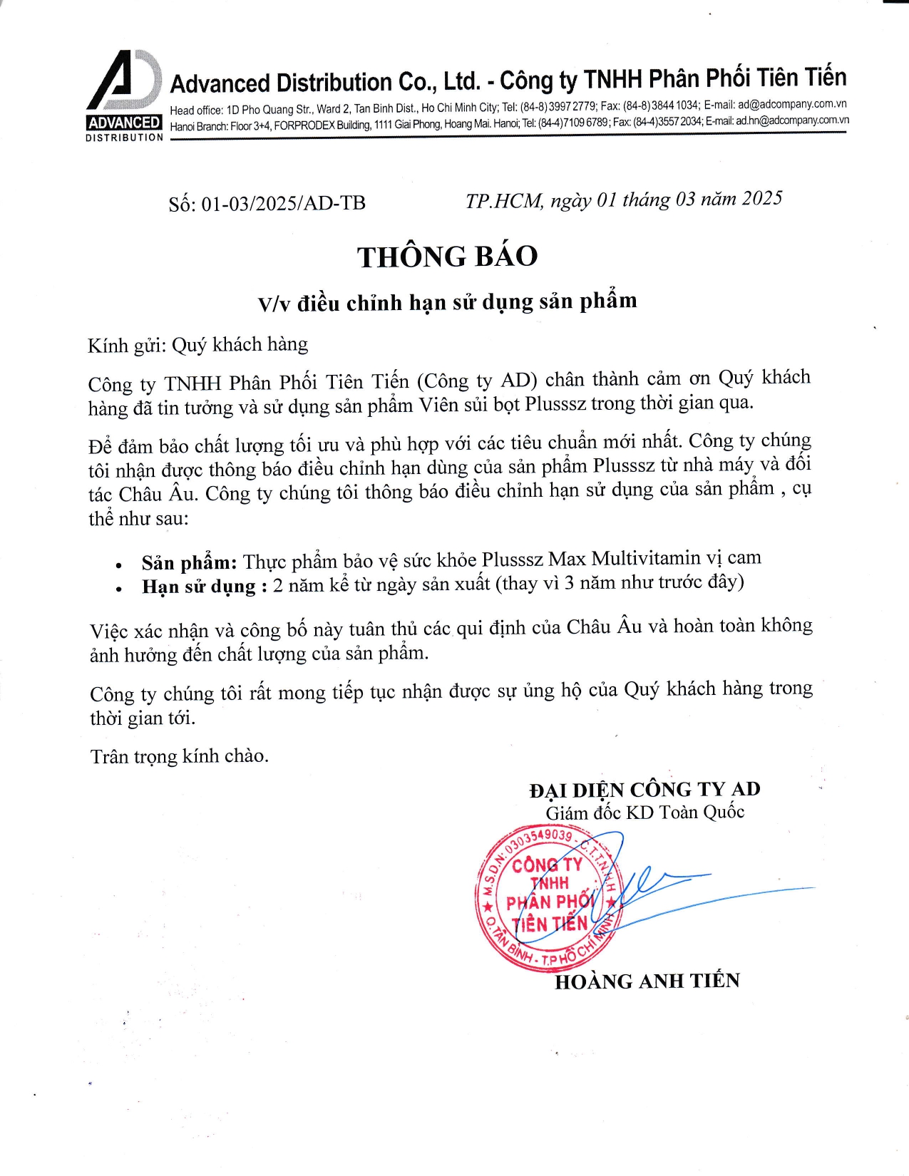 Công ty TNHH Phân Phối Tiên Tiến (Công ty AD) chân thành cảm ơn Quý khách hàng đã tin tưởng và sử dụng sản phẩm Viên sủi bọt Plusssz trong thời gian qua.